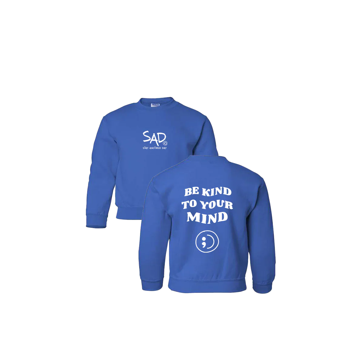 Be Kind To Your Mind Crewneck screen printed design. This super comfortable Crewneck features the small SAD logo on the front with the Stay Another Day text below, as well as the Youth Larger Be Kind To Your Mind Bubble Print text on the back.