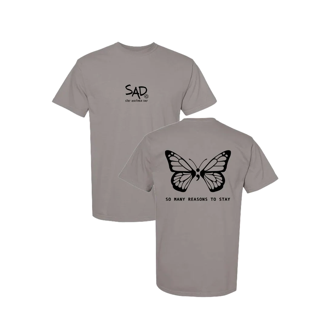 Butterfly with So Many Reasons To Stay text screen printed design T-shirt. This super comfortable T-shirt features the small SAD logo on the front with the Stay Another Day text below, as well as the larger Butterfly print with text on the back.