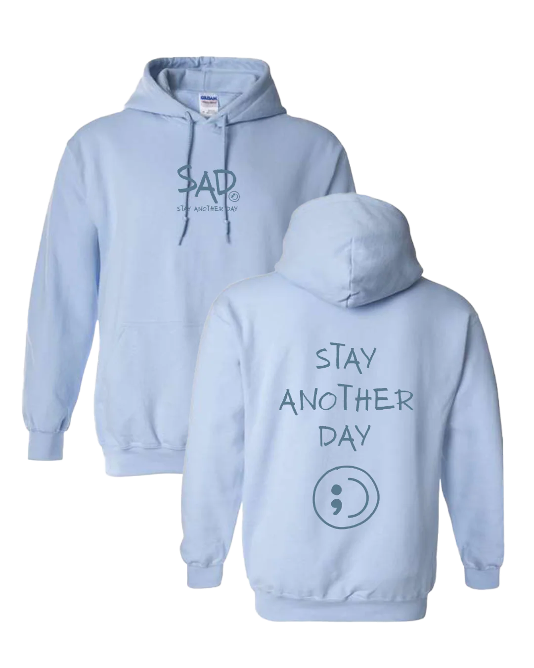 Stay Another Day hoodie featuring our original monochromatic screen-printed design. This super comfortable hoodie features the small SAD logo on the front with matching tonal Stay Another Day text below, along with a larger monochromatic Stay Another Day logo with smiley print on the back.